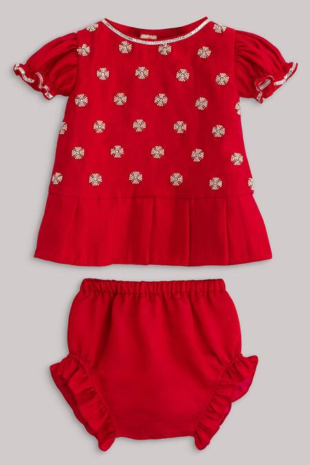 Red top featuring floral bead embroidery and puff sleeves. Paired with coordinating shorts with ruffle detailing.