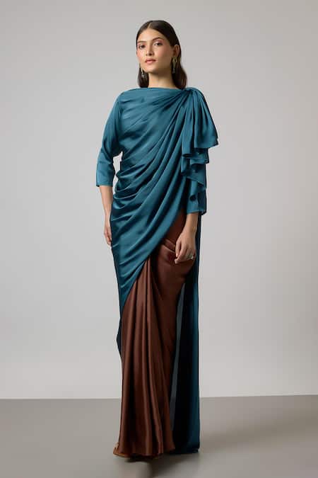 A teal blue satin top features a draped silhouette, boat neckline, and three-quarter sleeves with cascading frill detailing. It is paired with a brown satin draped pleated skirt.