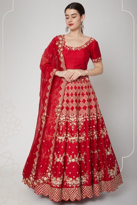 Red Raw Silk, Organza Boat Embroidered Bridal Lehenga Set