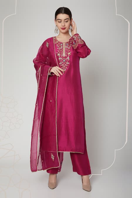 Magenta kurta with floral embroidered motifs. Paired with pant & dupatta.