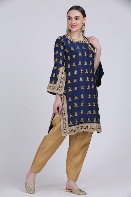 Electric blue kurta with floral embroidered motifs. Paired with salwar.