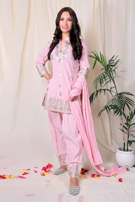 Pink short kurta with floral gota work embroidered motifs. Paired with embroidered salwar & dupatta.