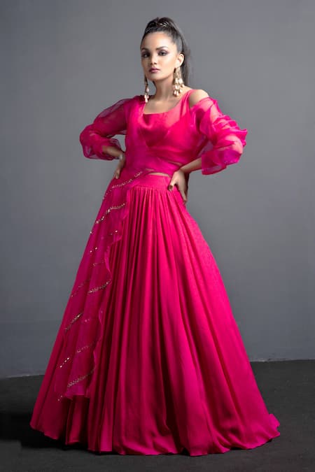 Fuchsia lehenga with flared silhouette. Paired with square-neck sleeveless blouse & embroidered, panelled organza drape.