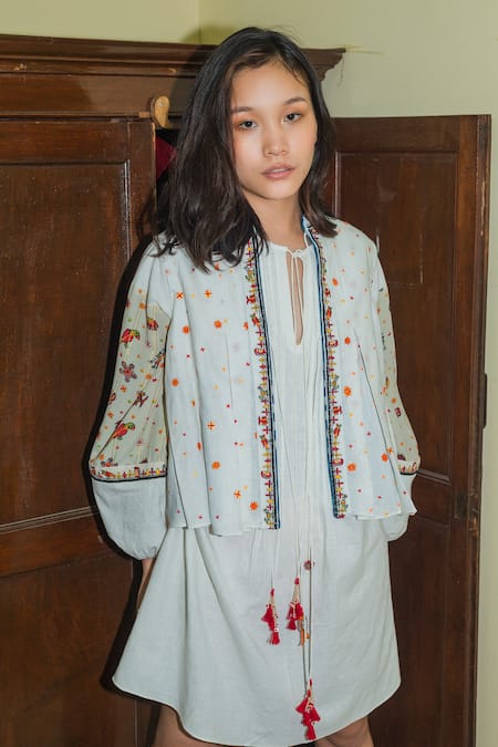 White jacket with all-over embroidery and tie-up at the front.