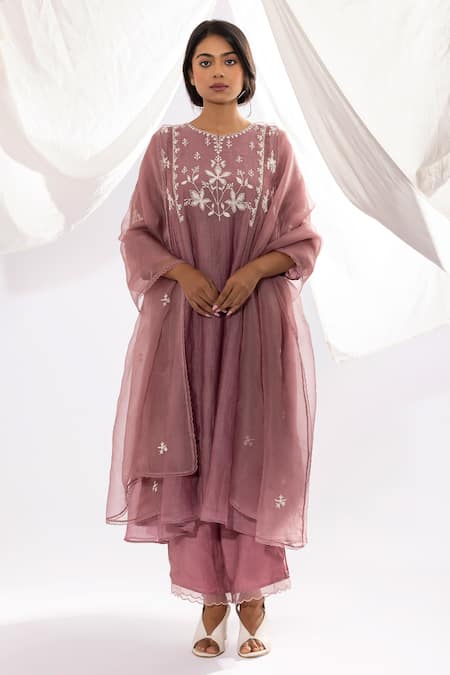 Purple kurta featuring hand-embroidered floral and polka dot patterns with puffed sleeves. Paired with cotton silk straight pant and a silk organza dupatta with lace work.