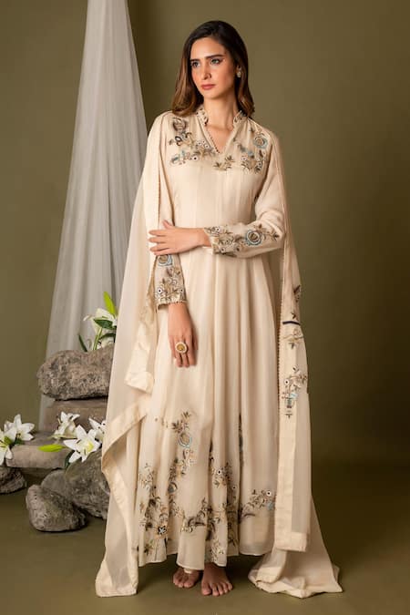 Ivory organza anarkali featuring floral embroidery and a mandarin collar. Paired with a matching dupatta and attached lining.