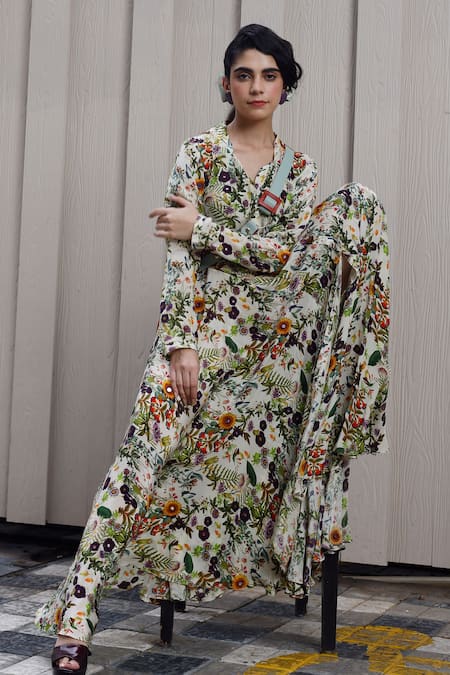 Green crepe gown featuring floral print with all-over embroidery highlights