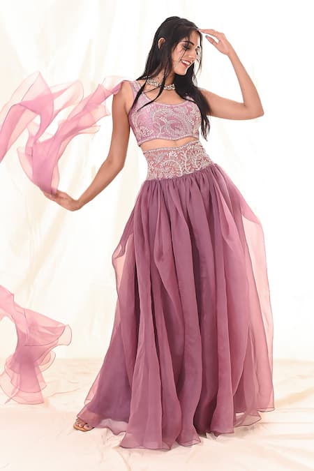 Amethyst purple cowl high-waisted lehenga featuring glass beads, sequins, and mirror embroidery on the waistline. Paired with a sleeveless blouse and a ruffled dupatta.