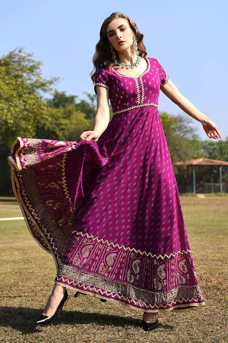 Aubergine 18 kali anarkali with all-over floral print, sequin hand embroidery, leaf neckline and cap sleeves.