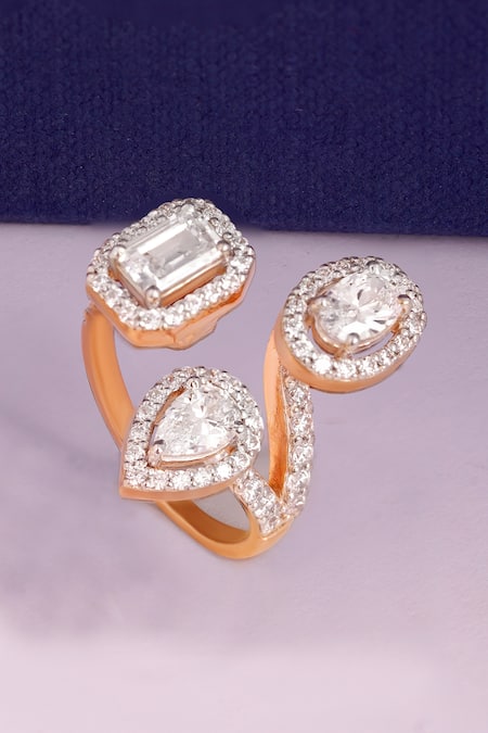 Rose gold plated ring featuring a combination of pear, emerald, and oval-cut stones