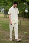 Yellow band collar shirt made from linen cotton featuring shell button detailing. Paired with solid woven pants designed with pockets.