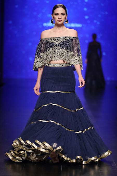Midnight blue lehenga with net layers. Paired along with blue embellished sequin cape in an off-shoulder style. It comes along with a silk bustier.