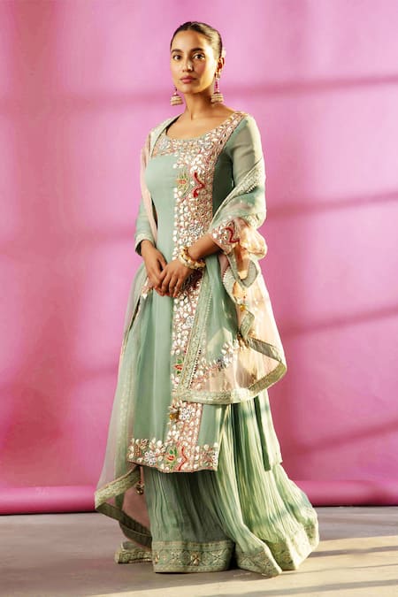 Teal blue kurta with floral gota embroidered motifs. Paired with embroidered hem sharara & dupatta.