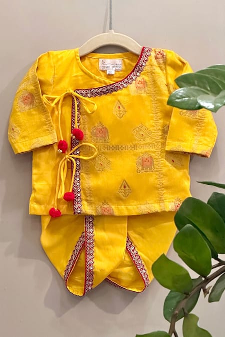 Yellow kurta featuring sequins embroidered borders and overlap detailing. Paired with a matching dhoti pant for a complete look.