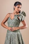Pista green gown featuring a sweetheart neckline, asymmetric sleeves, and a sheer panelled front