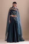 Bottle green lehenga featuring draped design with crystal, cutdana, sequins and Swarovski embroidery. Paired with a strapless padded blouse and a detachable shimmer finish cape.