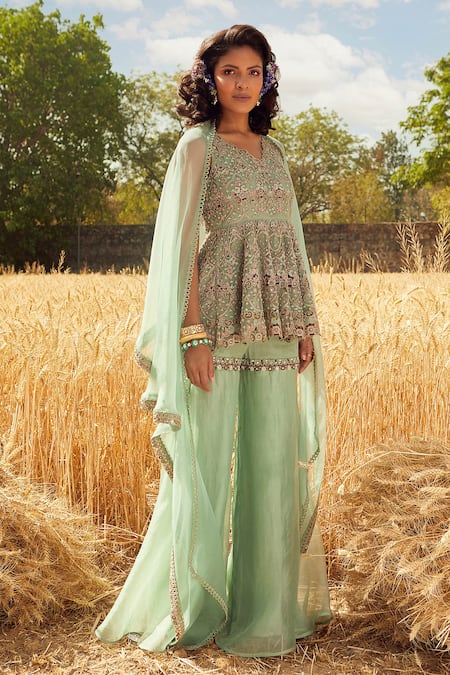 Aqua peplum tunic with multi-color floral motif work. Comes with embroidered border dupatta & sharara pants.