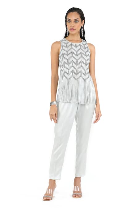 Ice blue fringe top embellished with tonal crystal beads and metallic sequins in a chevron pattern