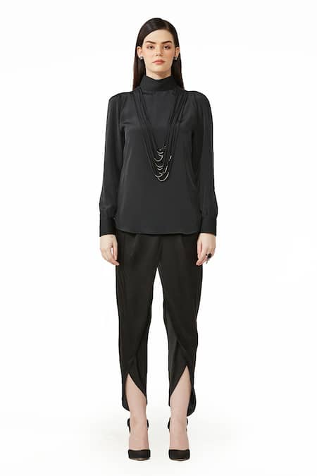 Black mock neck top crafted from georgette featuring full sleeves and embellished metallic rings detailing