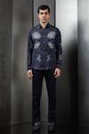 Midnight navy shirt featuring a rolling square print and a spread collared neckline