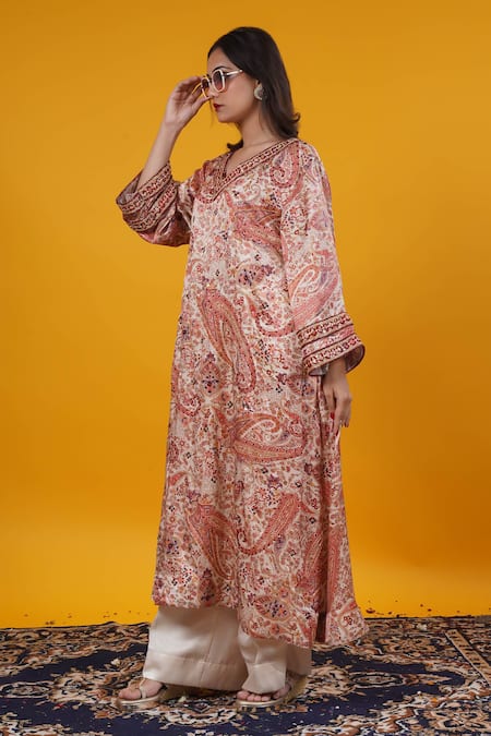 Ivory Silk V-neck Paisley Print Kurta With Pant