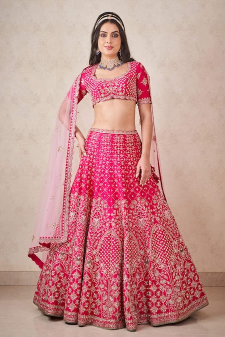 Hot pink lehenga featuring zardosi hand embroidery and an attached cancan. Accompanied by a padded blouse and a blush pink tulle dupatta.