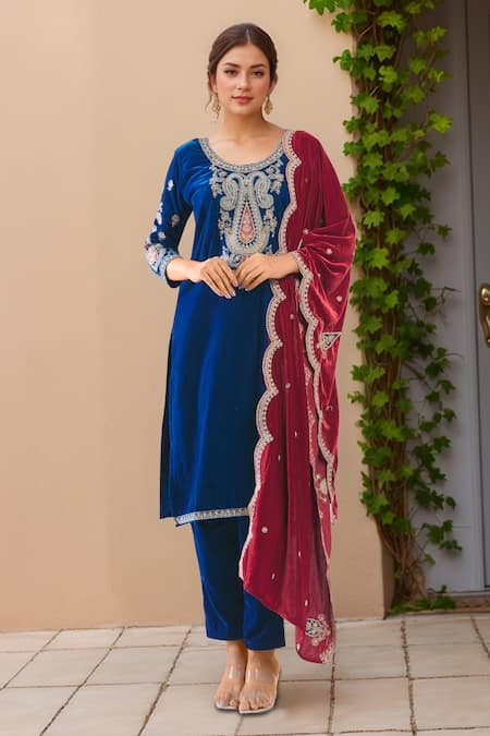 Teal velvet kurta featuring intricate embroidery and three-quarter sleeves. Paired with matching pants and a contrasting dupatta for added elegance.