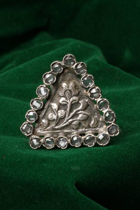 Silver toned triangle shaped ring featuring a floral carved pattern and stone embellishment
