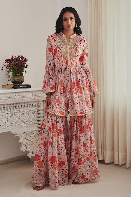 Pink kurta featuring a notched neckline, bell sleeves, and intricate floral embroidery. Paired with a matching gharara, both adorned with sequin and thread work.