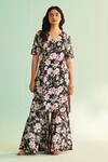 Black kurta featuring floral vine print with hand embroidery in sequins and beads. Paired with a matching printed sharara and a dupatta with cutwork border.