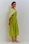 Green kurta featuring side gathers, attached waist bag & double front slits. Paired with a dhoti pant and inner slip.