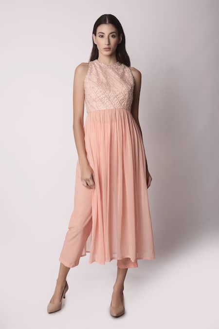 Peach kurta with embroidery on the yoke and side slits. Comes with cropped straight pants.