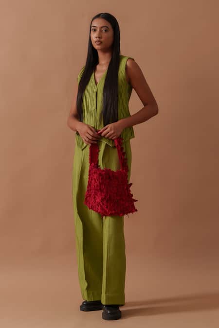 Green Handloom Cotton V-neck Sunflower Pleated Waistcoat
