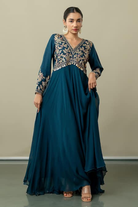 Blue Anarkali featuring floral hand embroidery on the yoke and sleeves