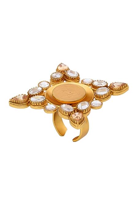 Noteworthy Feature: Embellished with crystal stones in various shapes, Features a central coin detail, Contemporary design with a wide band