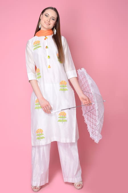 White straight long kurta with placement floral motif patchwork & tassel placket. Comes with pants & contrast chiffon dupatta.