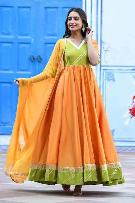 Yellow color block anarkali featuring gota patti embroidery on the bodice, cuffs, and hem. Paired with a coordinating dupatta for a complete look.