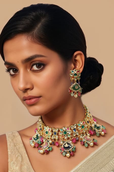 Gold finish necklace set featuring imitation kundan and semi-precious stones. Includes a matching pair of earrings with similar design elements.