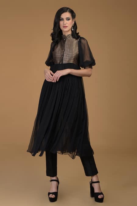 Black anarkali with silk brocade bodice and high neck. Paired with slim pants.