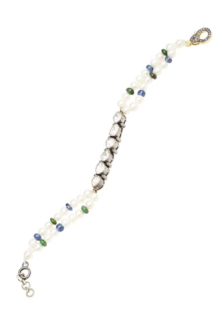 Black sterling silver bracelet featuring polki diamonds, pearls, emeralds, and sapphires