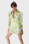 White shirt featuring yellow leaf print, woven pattern, and front button closure