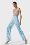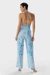 Blue pant featuring aqua stencil botanic patterns printed on linen fabric
