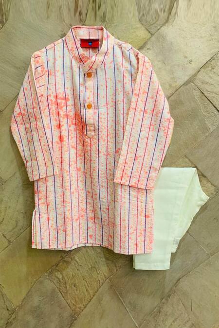 White kurta featuring neon splatter and printed stripes with a front button placket. Paired with an elasticated pant for comfort.