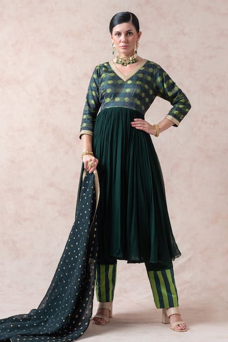 Green woven anarkali featuring floral motifs on the yoke and a back zip closure. Paired with striped border pant and embroidered dupatta.