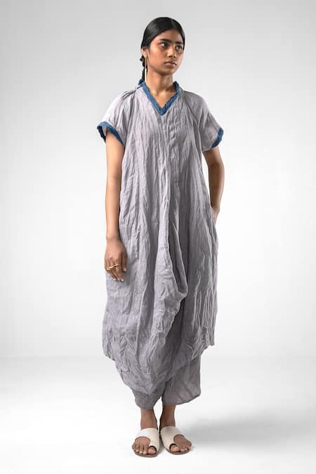 A pearl grey crushed cotton linen dress featuring a V-neckline with a contrast blue trim, cap sleeves, and an asymmetric hem.