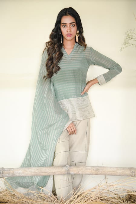 Green Handwoven Zari Cotton Stripes V Neck Bakul Draped Sleeve Top
