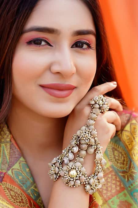 No of Component: 1Components: BraceletNoteworthy Feature: Intricate beadwork creating a floral motif, Shells incorporated into the design, Unique antique finish enhancing vintage appealOccasions: Festive and traditional eventsStyle Genre: Fusion of traditional and contemporary stylesPattern: Self DesignType of Work: Pearls, BeadsColor: Gold, SilverComposition: BrassSize Details: Length: 11cm, Width: 15cmWeight Details: Product Weight: 0.88GmVisible Items not included: Only single piece bracelet is being sold.Care Instruction: Keep away from sunlight and moisture. Store in a cool, dry place. Wipe with soft cloth. Avoid perfumes and chemicals.Style: Kundh Hathpool styleLength: Length of 11 cmExact Length: Length of 11 cmExact Width: Width of 15 cmExact Weight: Weight of 0.88 gramsChain Style: Intricate bead and pearl designFinish Style: Antique finishWeight: Lightweight braceletWidth: Width of 15 cmCharm Style: Floral and organic charm styleClosure Style: Adjustable hook closureGemstone Clarity: No gemstone clarityGemstone Color: No gemstone colorGemstone Cut: Gemstone cut not discernibleGemstone Shape: Round and oval shapes evidentGemstone Transparency: Opaque gemstonesPlating: Antique gold platingSetting Style: Cluster setting style