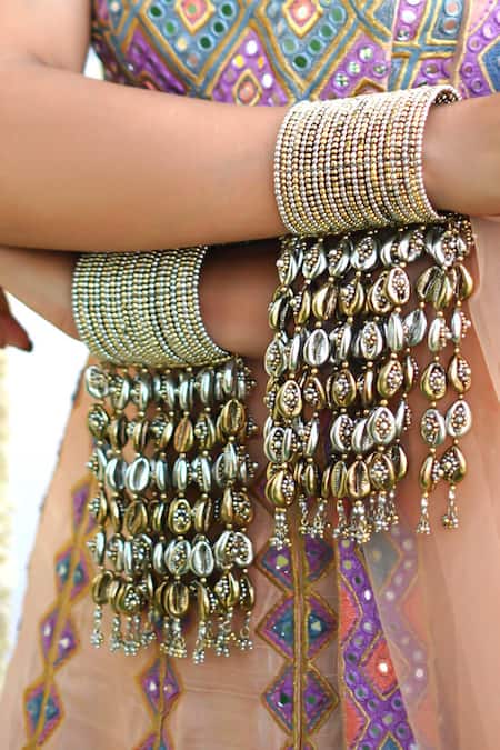 No of Component: 1Components: BangleNoteworthy Feature: Cascading design of shells and beads, Intricate beadwork detailing, Antique finish with a luxurious lookOccasions: Ideal for festive occasionsStyle Genre: Indian style bangleType of Work: Pearls, BeadsColor: Silver, GoldComposition: Brass, PearlSize Details: Length: 14cm, Width: 7cmWeight Details: Product Weight: 0.412GmVisible Items not included: The outfit worn by the model is not for sale.Care Instruction: Keep away from sunlight and moisture. Store in a cool, dry place. Wipe with soft cloth. Avoid perfumes and chemicals.Style: Layered beaded stylePattern Style: Ethnic beaded designExact Length: Length of 14 cmExact Width: Width of 7 cmExact Weight: Weight of 0.412 gramsDiameter: Standard diameterEthnicity: Indian ethnicityFinish Style: Antique finishSet Count: Set typically includes 2 banglesDimensions: Standard size 14cm lengthThickness: Medium thicknessWeight: Lightweight at 0.412 gramsClosure Style: Slip-on styleGemstone Clarity: No gemstone clarityGemstone Color: No gemstone colorGemstone Cut: No visible gemstone cutGemstone Shape: No specific gemstone shape visibleGemstone Transparency: OpaquePlating: Antique gold platingSetting Style: No specific setting style visible