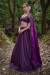 Purple lehenga featuring intricate iris bloom embroidery with cutdana and bead highlights. Paired with a sleeveless matching padded blouse and an embroidered cutwork border dupatta.