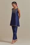 Blue A-line kurta featuring a notched neckline with sequin embroidery on the front yoke and lace details at the hem. Paired with solid blue pants, this set is crafted from handwoven Chanderi fabric and includes an attached inner lining.